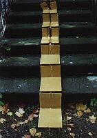 horizontála (poč. 1999) lutý parafín, bavlna, instalace - dřevěné trámky 60x160x1,5cm Hoření je evidentně spojeno s časem, věci pohlcuje, proměňuje, ničí; to je obecné, ale hlavní je jeho výsledek - kresba a fragmentace zdánlivě celistvé plochy. |