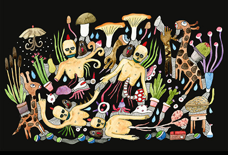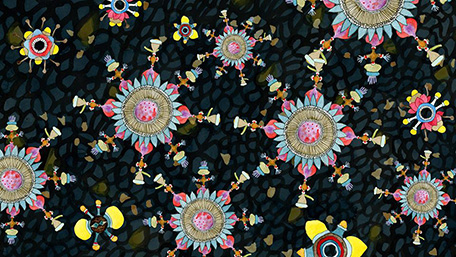 Sewed pictures related to the story "Great-granma's carpet" (various fabrics on wooden frames, 100x75cm)