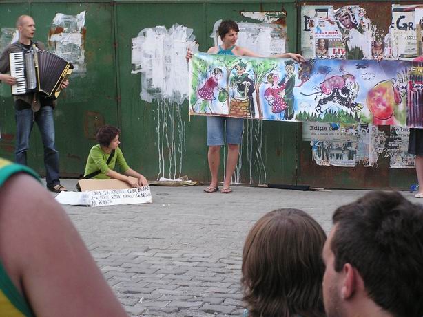 ![]() Performance with intention to bring live to the streets. In the centre of Bucuresti, with children from the street we entered ruins of abandoned houses, caferuly removed many of wild living plants and brought them to public spaces. We were doing music and watering the flowers. Some of czech songs were painted, translated to romanian language and performed for public. "Start Point", Klenová - castle gallery, Czech republic http://media-archiv.ffa.vutbr.cz/artwork.php?id=25